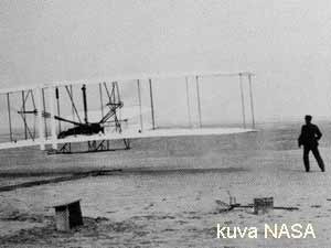 - Wrightin veljesten kone ”Flyer” irtosi maasta 12 sekunniksi ja lensi 36,5 metriä, lentäjänä Orville Wright. Veljekset aloittivat tutkimalla leijojen lentoa. Heitä innosti lapsuudessa lahjaksi saatu leikkihelikopteri.