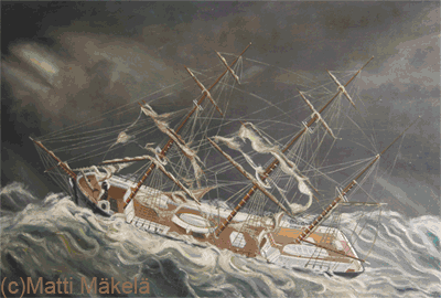 Pidä katse vaan mastossa, komensi Oskar itseään. Nyt hänen ja myrskyävän Atlantin välissä ei ollut enää muuta kuin pitkä pudotus. Tällaisessa merenkäynnissä ei olisi mitään mahdollisuuksia selviytyä uimalla, ja tuskin laivan partaan yli heitetystä köydestä tai pelastusrenkaastakaan olisi mitään apua. Ihmisvoimat eivät riittäisi aallokkoa vastaan. Pelastusvenettäkin vaahtopäät paiskoisivat kuin lastua. Vain täysi kaheli edes laskisi parkassin tällä kelillä.