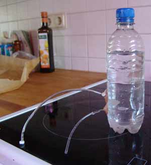 6. Jos letkut on kiinnityskohdat ovat ilmatiiviit, pulloon ei nyt pääse mistään ilmaa. Alemmasta letkusta ei silloin tule vettä ulos. Jos kiinnityskohdat vuotavat, sen huomaa siitä, että niiden kohdalta nousee ilmakuplia ja siitä, että alemmasta letkusta tulee vettä.