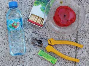 1. Ensin tein muovipulloon kaksi reikää letkuja varten. Kuvassa letkut ovat lähellä toisiaan, mutta nyt sijoittaisin ilmaletkun mahdollisimman ylös ja kasteluletkun mahdollisimman alas. Sulatin rei'ät muoviin naulalla, jonka olin kuumentanut kynttilän liekissä. Otin naulasta pihdeillä kiinni ja pidin sitä liekissä jonkin aikaa. Ilman pihtejä olisin polttanut näppini.