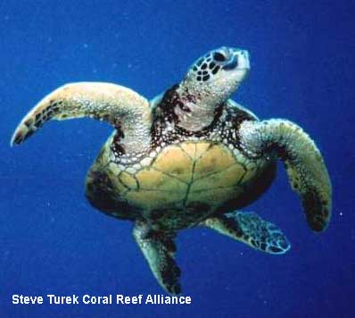 Alempaa koralliluolan suulta kurkistelee mureena ja kauempana ui kilpikonna. Näyttää aivan kuin se lentäisi.