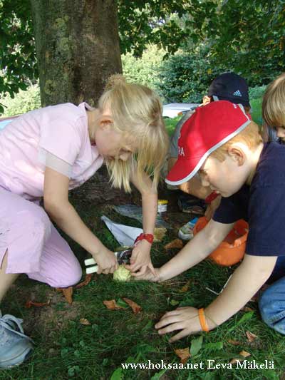 Olimme valmistelleet ruokapalat etukäteen. Jokaisessa oli ripustuslenkki kuin joulukuusenkoristeissa. Puistossa pujotin ruokapalat pyykkinaruun, viritin sen kahden puun väliin ja sitten levittelimme herkut killumaan tasaisin välimatkoin niin, että kisailijat mahtuivat helposti syömään niitä.
